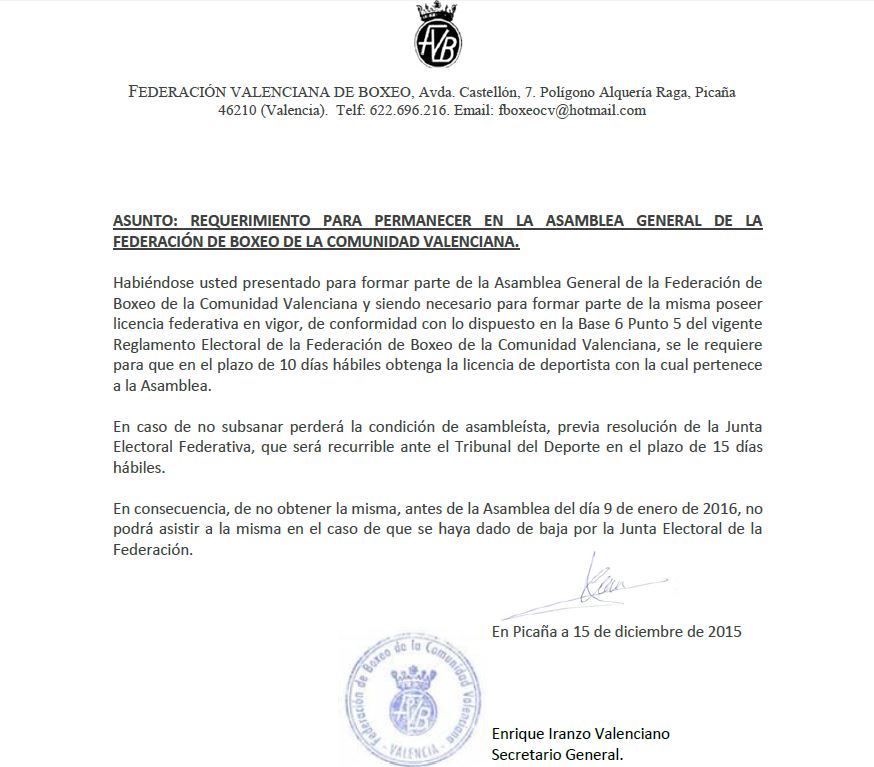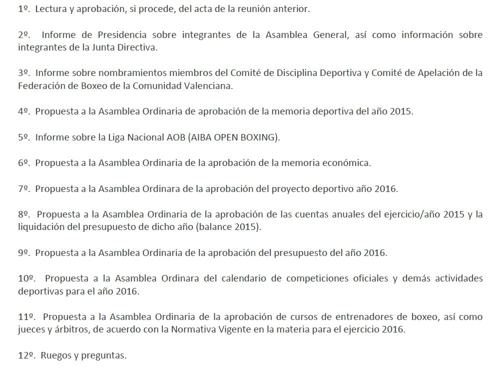 Mediante Resolución de Presidencia de la Federación de Boxeo de la Comunidad Valenciana de fecha 9 de diciembre de 2015, se ha convocado reunión de la Asamblea Ordinaria a celebrar el próximo día 9 de enero de 2016, a las 16:00 horas en primera convocatoria y a las 16:30 horas en segunda, en el aulario de Levantina de Seguridad, sito en el Pasaje Ruzafa nº 4 al 10 de Valencia, con el siguiente orden del día:
