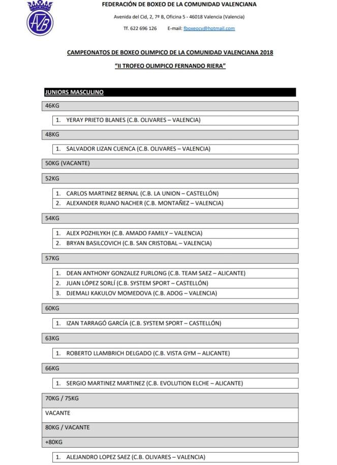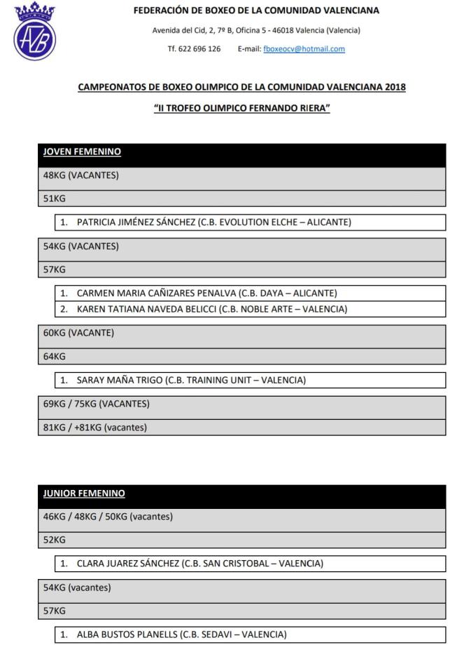 Gran éxito de inscripción en los Campeonatos de la Comunidad Valenciana de Boxeo Olímpico 2018, más de 100 inscritos en todas las categorías demuestra el buen momento que vive el boxeo valenciano. Destaca el gran número de participantes en la categoría de menos de 69 kilos masculino élite donde se han registrado nada más y nada menos que 19 boxeadores que intentarán llevarse el oro para su club. Los clubes, por su parte, han demostrado un gran compromiso con la competición y seguro que lucharán para llevarse el «II Trofeo Olímpico Fernando Riera» que da nombre a estos Campeonatos.