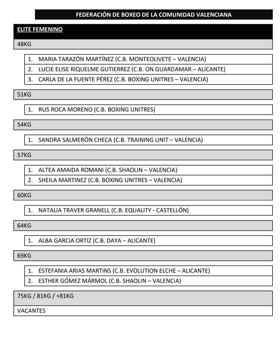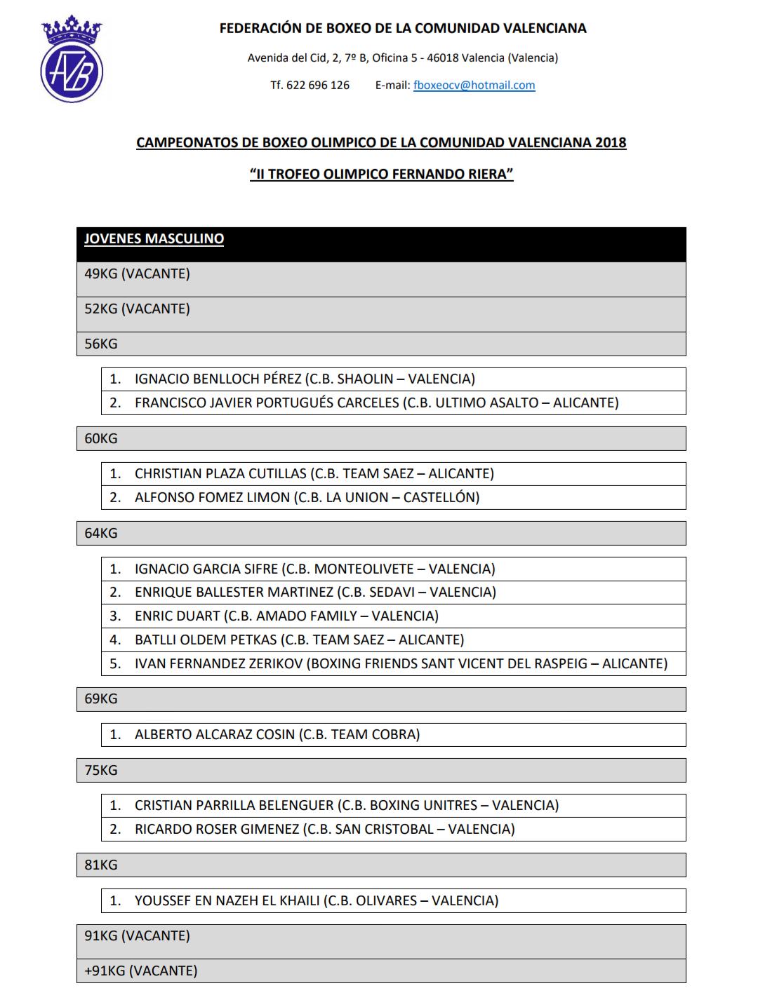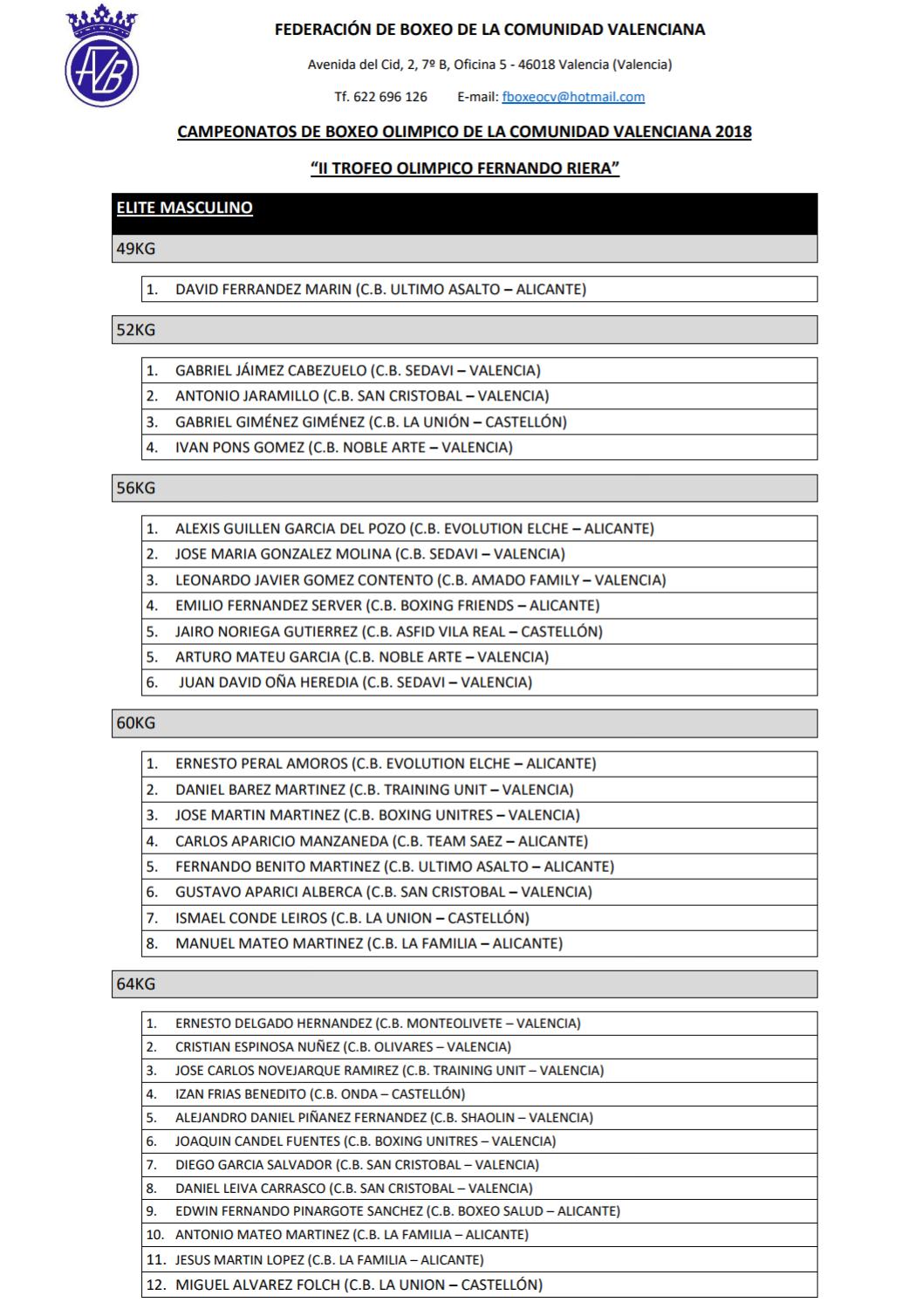 Gran éxito de inscripción en los Campeonatos de la Comunidad Valenciana de Boxeo Olímpico 2018, más de 100 inscritos en todas las categorías demuestra el buen momento que vive el boxeo valenciano. Destaca el gran número de participantes en la categoría de menos de 69 kilos masculino élite donde se han registrado nada más y nada menos que 19 boxeadores que intentarán llevarse el oro para su club. Los clubes, por su parte, han demostrado un gran compromiso con la competición y seguro que lucharán para llevarse el «II Trofeo Olímpico Fernando Riera» que da nombre a estos Campeonatos.