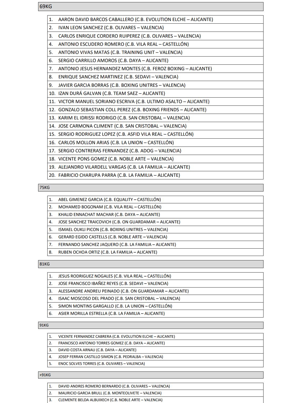 Estos son los inscritos en todas las categorías y pesos: