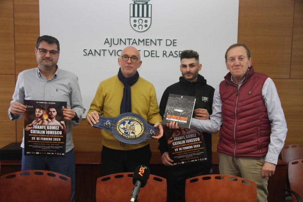 En la presentació del combat valedor per a la disputa el pròxim dia 25 de febrer del cinturó de campió d’Europa súper ploma a San Vicente del Raspeig entre Juanfe Gómez i Ionut Catalin, el president de la Federació de Boxeig de la Comunitat Valenciana, en nom de tots els estaments que la componen i en agraïment a la col·laboració de l’Ajuntament del municipi alacantí en la celebració del que serà el quart Campionat d’Europa en terres alacantines, va entregar el llibre del Centenari a l’Alcaldia i a la Regidoria d’Esports de l’Ajuntament de San Vicente del Raspeig.