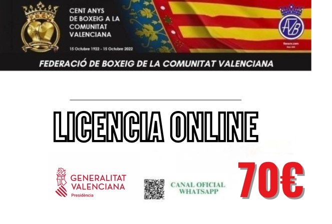 LICENCIA ONLINE PARA BOXEADOR AMATEUR, ENTRENADOR, AYUDANTE DE ENTRENADOR Y JUEZ/ÁRBITRO POR 70€. MENORES DE 14 AÑOS PAGAN 50€. RELLENA EL FORMULARIO WEB CON TUS DATOS, SUBE TUS DOCUMENTOS Y EL JUSTIFICANTE DE TU PAGO Y OBTEN TU LICENCIA ONLINE! ASÍ DE FÁCIL, ASÍ DE RÁPIDO, EN MENOS DE LO QUE DURA UN ASALTO!