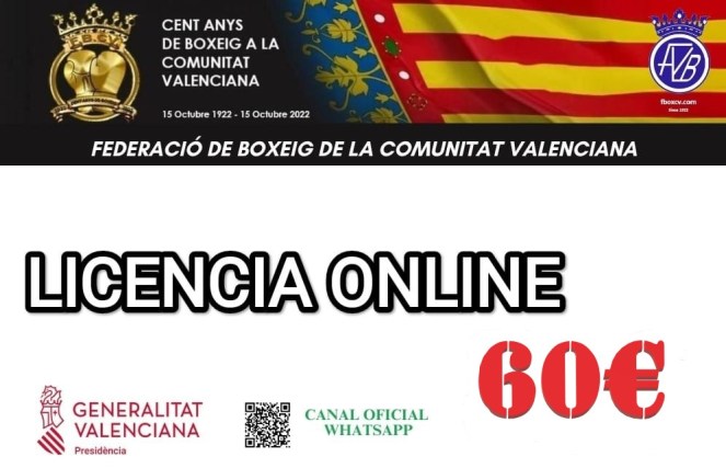 LICENCIA ONLINE PARA BOXEADOR AMATEUR, BOXEADOR PROFESIONAL, ENTRENADOR, AYUDANTE DE ENTRENADOR Y JUEZ/ÁRBITRO POR 60€. MENORES DE 14 AÑOS PAGAN 40€. RELLENA EL FORMULARIO WEB CON TUS DATOS, SUBE TUS DOCUMENTOS Y EL JUSTIFICANTE DE TU PAGO Y OBTEN TU LICENCIA ONLINE! ASÍ DE FÁCIL, ASÍ DE RÁPIDO, EN MENOS DE LO QUE DURA UN ASALTO!